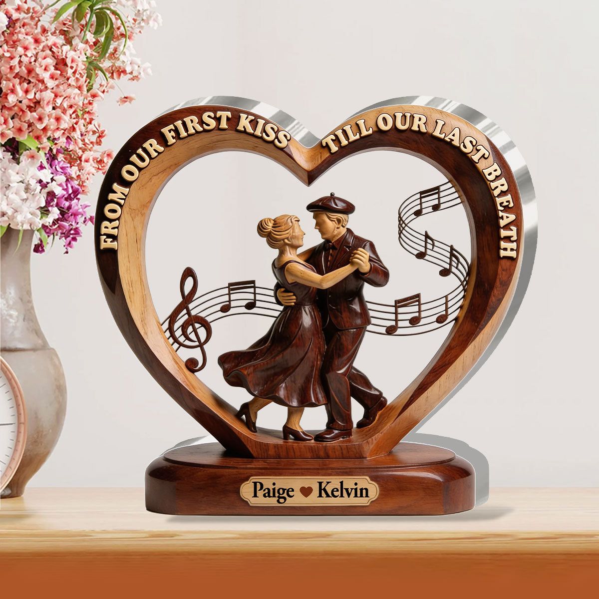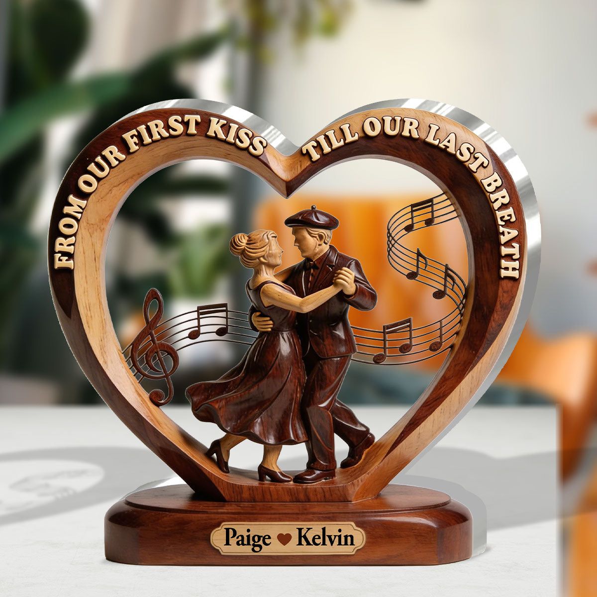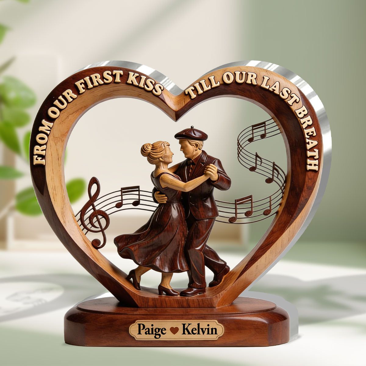 • Heart-shaped design with a dancing couple at the center, paired with flowing music notes and the romantic quote "From Our First Kiss Till Our Last Breath". Crafted to mimic warm, layered wood tones with a polished, timeless finish.