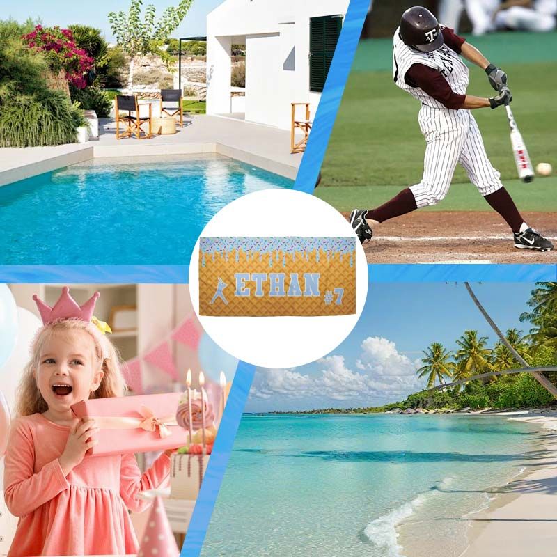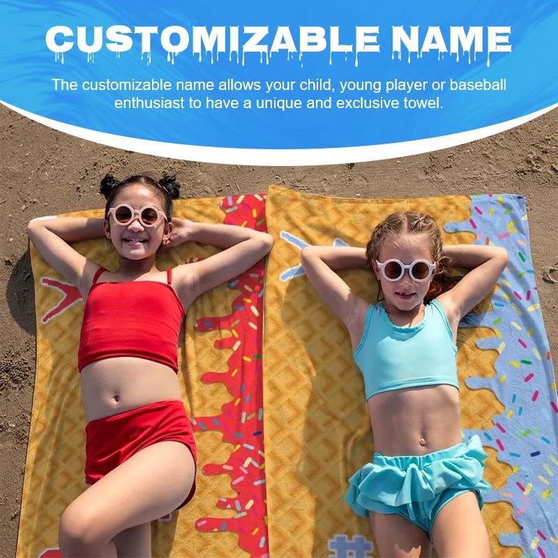 This unique baseball-themed personalized beach towel combines an ice cream drop design, which is cool and fun. The customizable name allows your child, young player or baseball enthusiast to have a unique and exclusive towel. Whether it is a beach vacation, a pool party or a baseball game day, this beach towel is the perfect companion.
