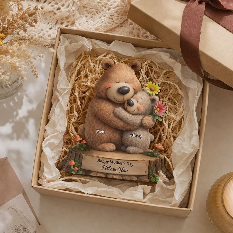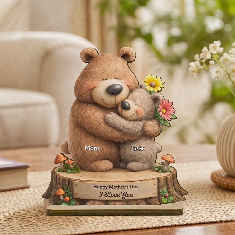 This adorable keepsake features a cozy mama bear and baby bear in a warm, loving hug, set on a charming tree-stump base decorated with mushrooms and flowers. The bears can be personalized with names (like Mom & Ashley), and the base features the heartfelt message "Happy Mother's Day I Love You". Crafted to mimic a hand-carved, 3D resin look, it brings a warm, whimsical touch to any space while being lightweight and durable for long-term display.