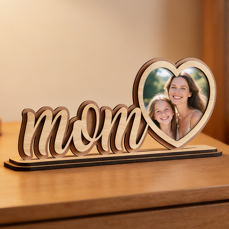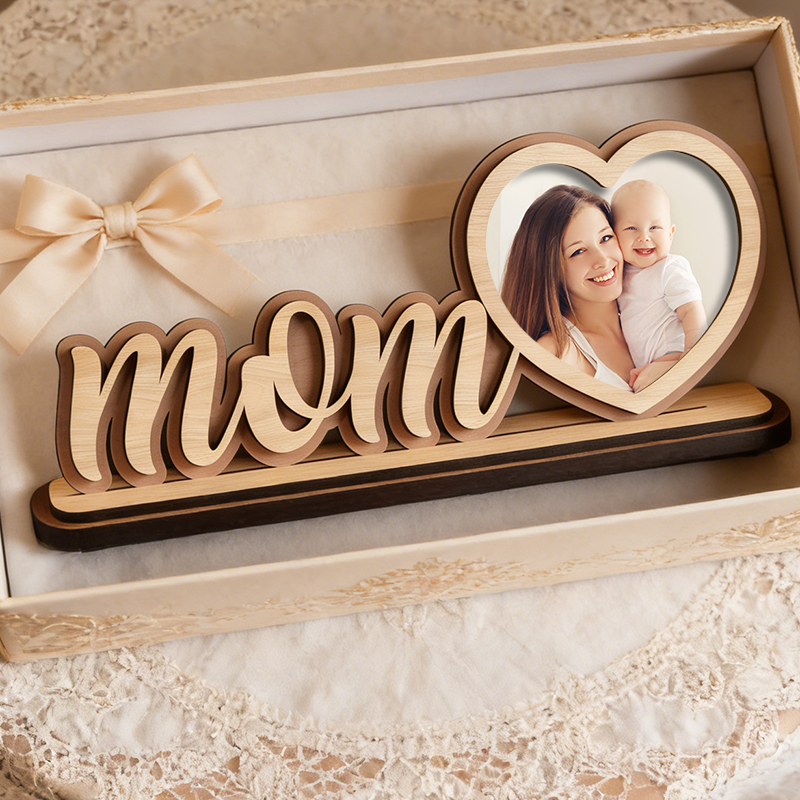 “Mom” Letters + Heart‑Shaped Photo Frame Design: A two‑layer wooden “mom” letter sculpture paired with a heart‑shaped photo frame seamlessly weaves the tender moments between mother and baby into a celebration of maternal love—full of warmth and ceremonial beauty.