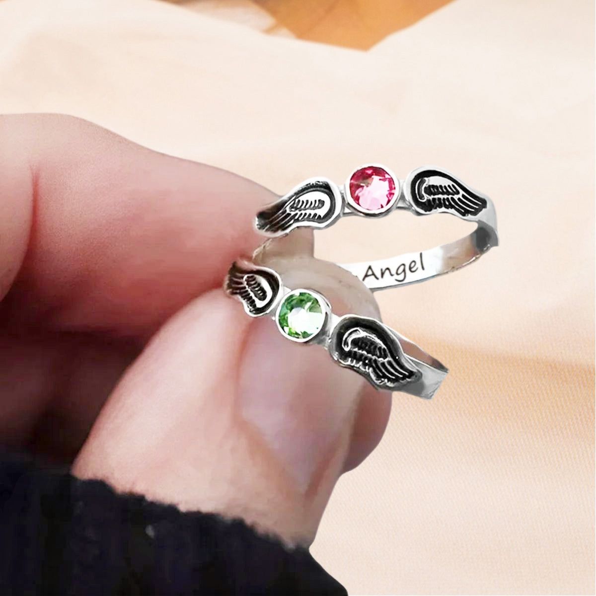 For Memorial - Personalized Name & Birthstone Angel Wing Ring