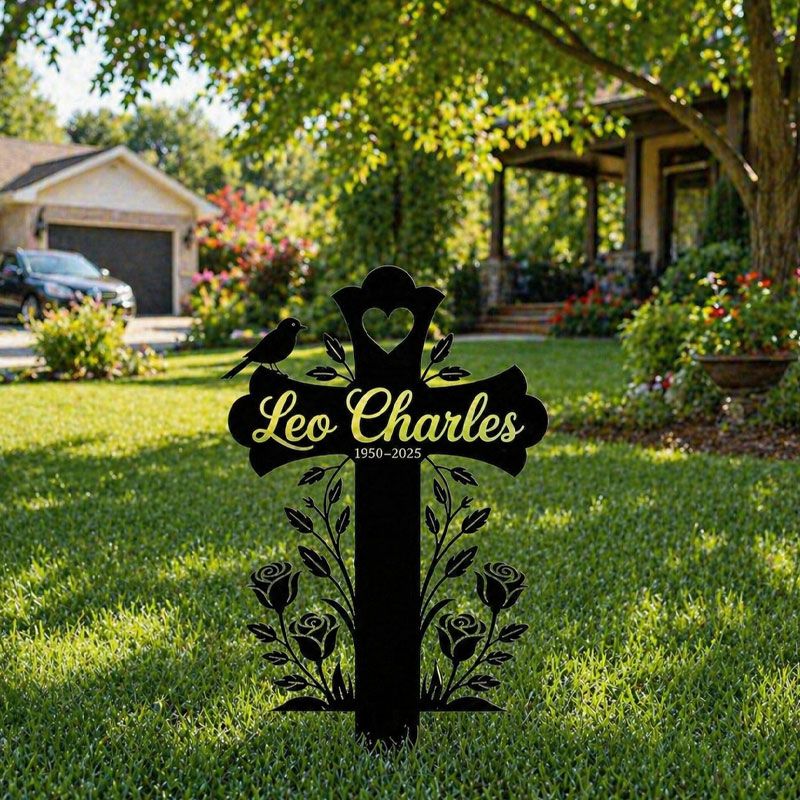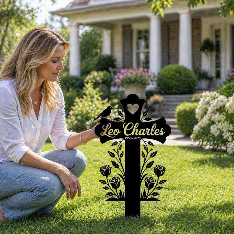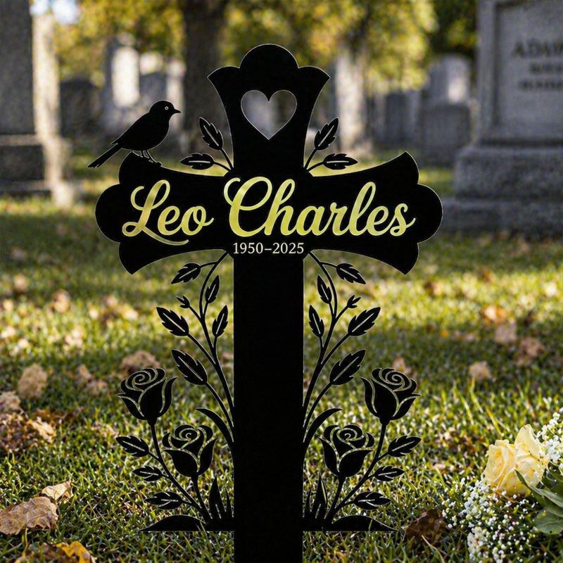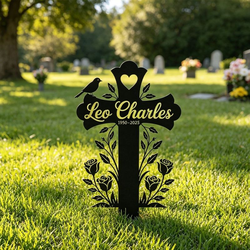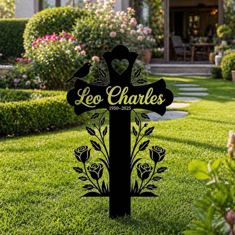 This elegant, laser-cut memorial cross is a quiet, lasting tribute to your loved one. Crafted from durable black steel, it features delicate rose vines, a perched bird, and a heart detail at the top, creating a peaceful silhouette against sunlight. The center can be fully personalized with their name and life dates, making it a unique, dignified marker for gravesides, memorial gardens, or quiet outdoor remembrance spaces. A gentle, meaningful way to honor a life well-loved.