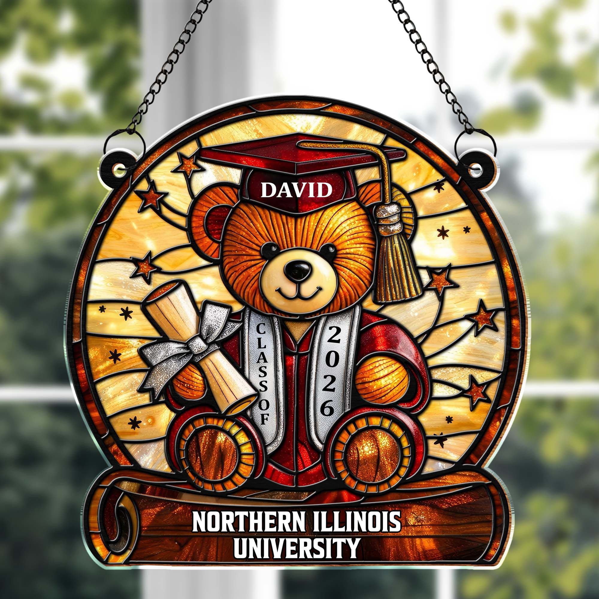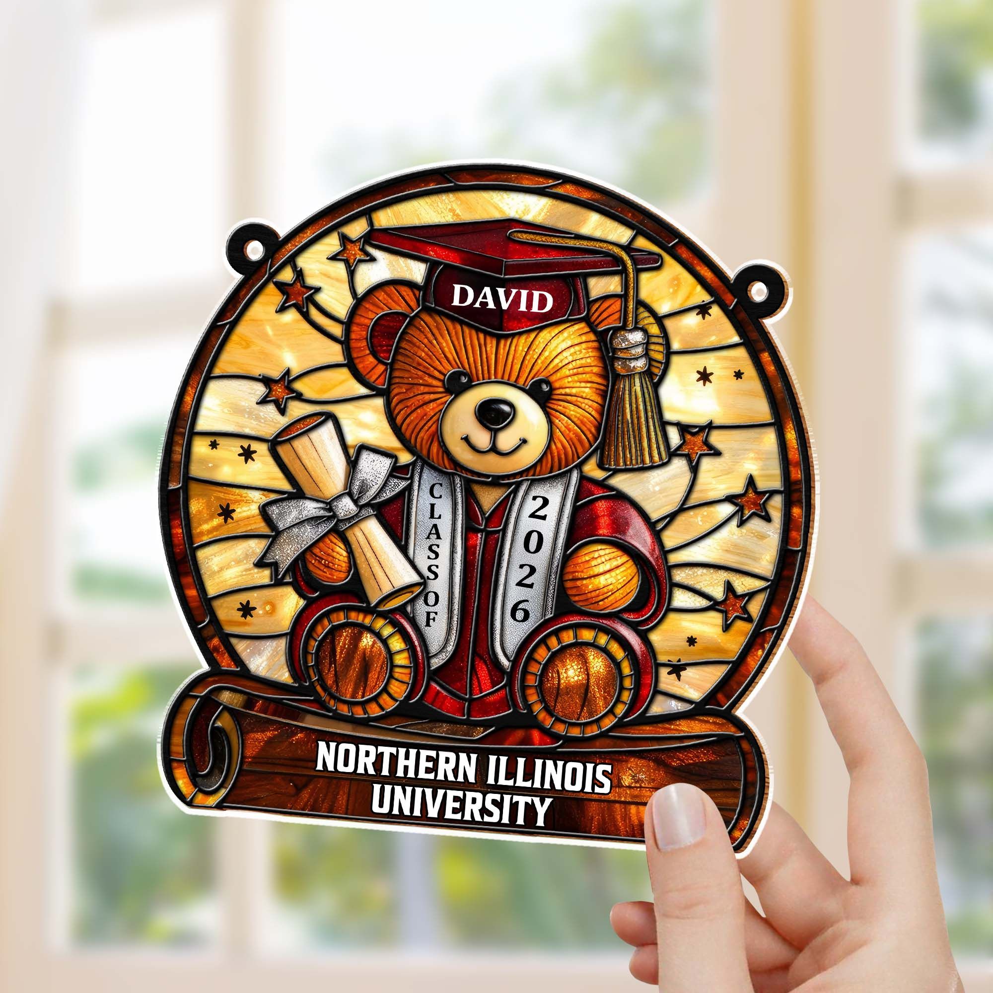 Personalized Graduation Bear Stained Glass Suncatcher | Custom Name & University Keepsake