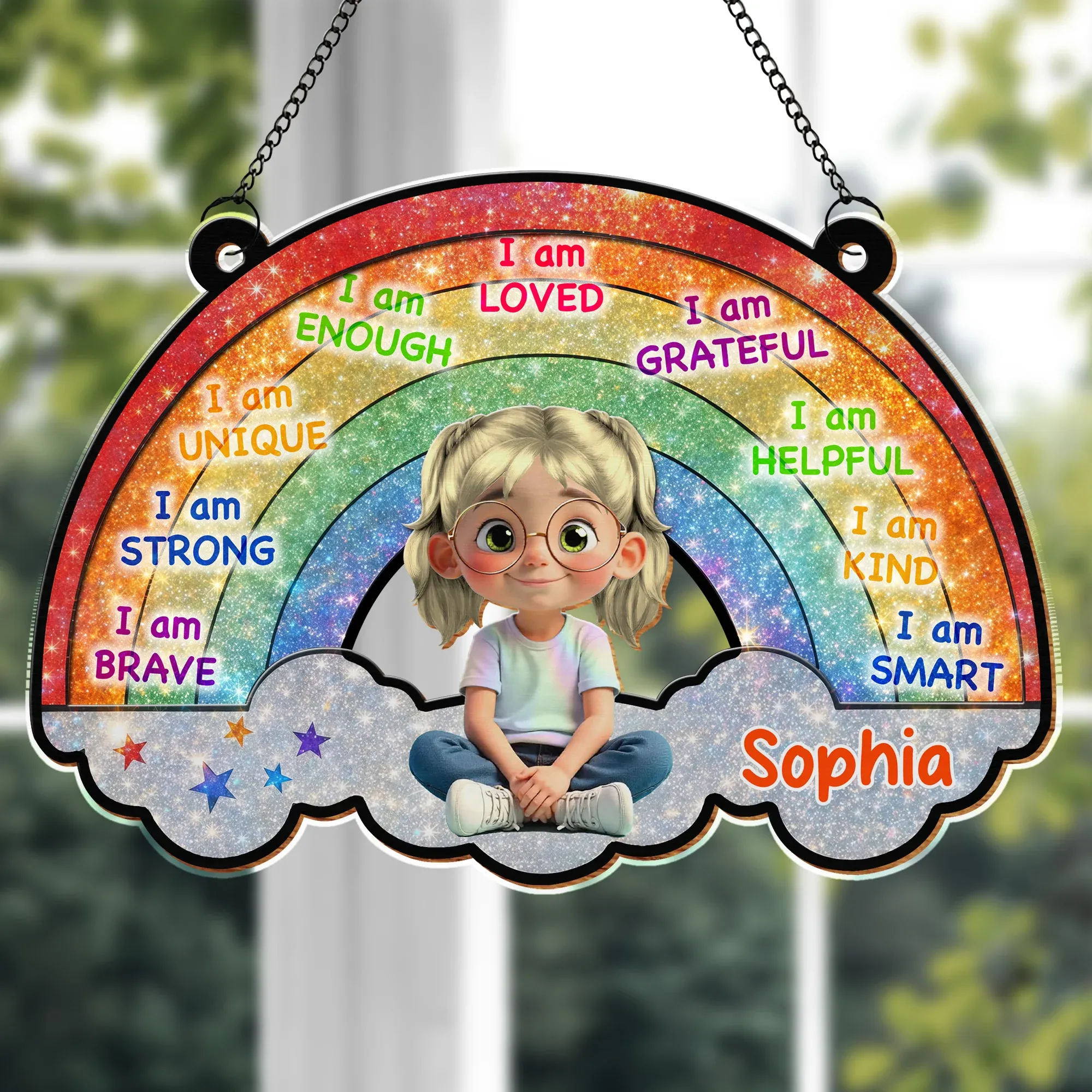 Personalized Rainbow Affirmations Suncatcher | Custom Name & Cartoon Kid Positive Affirmation Keepsake
