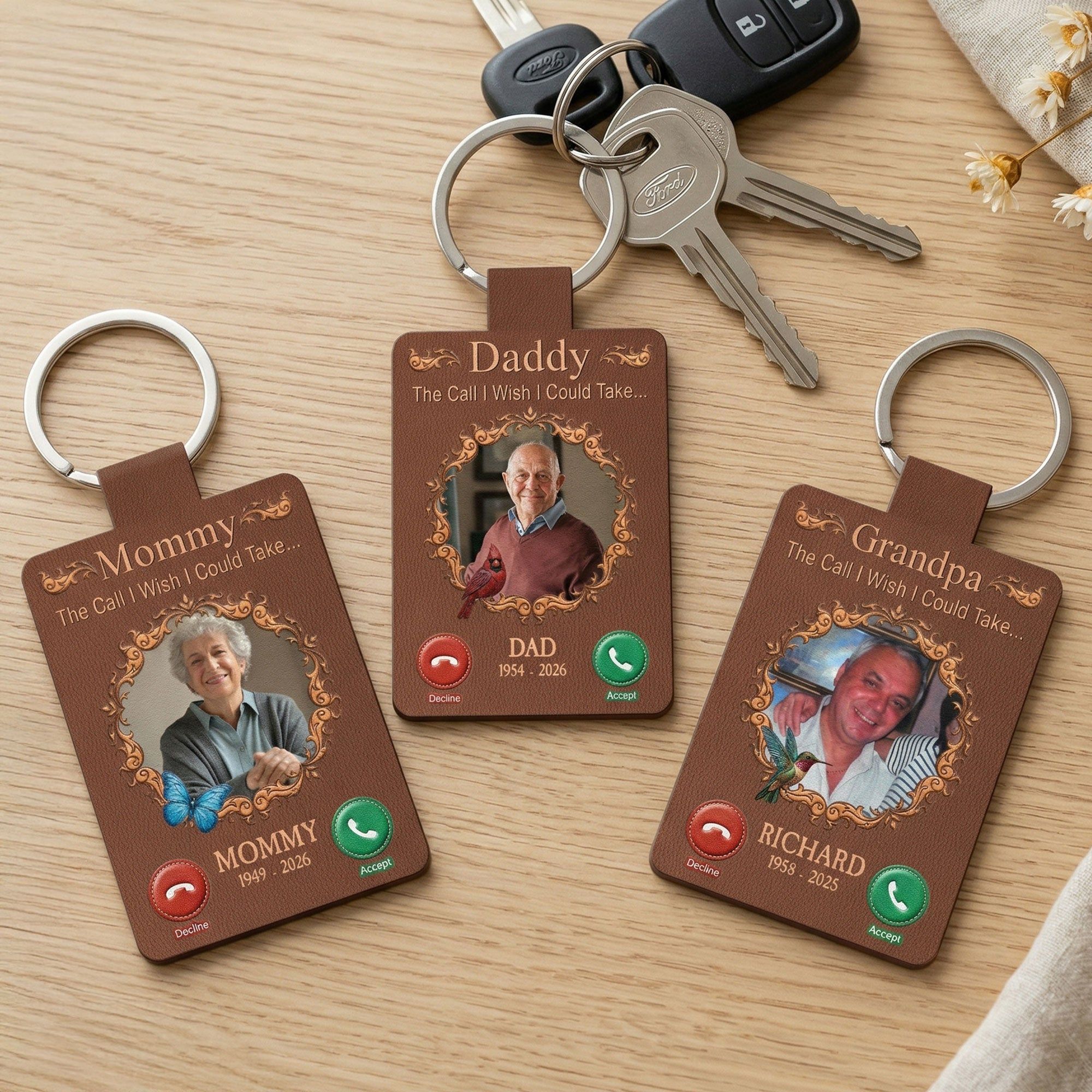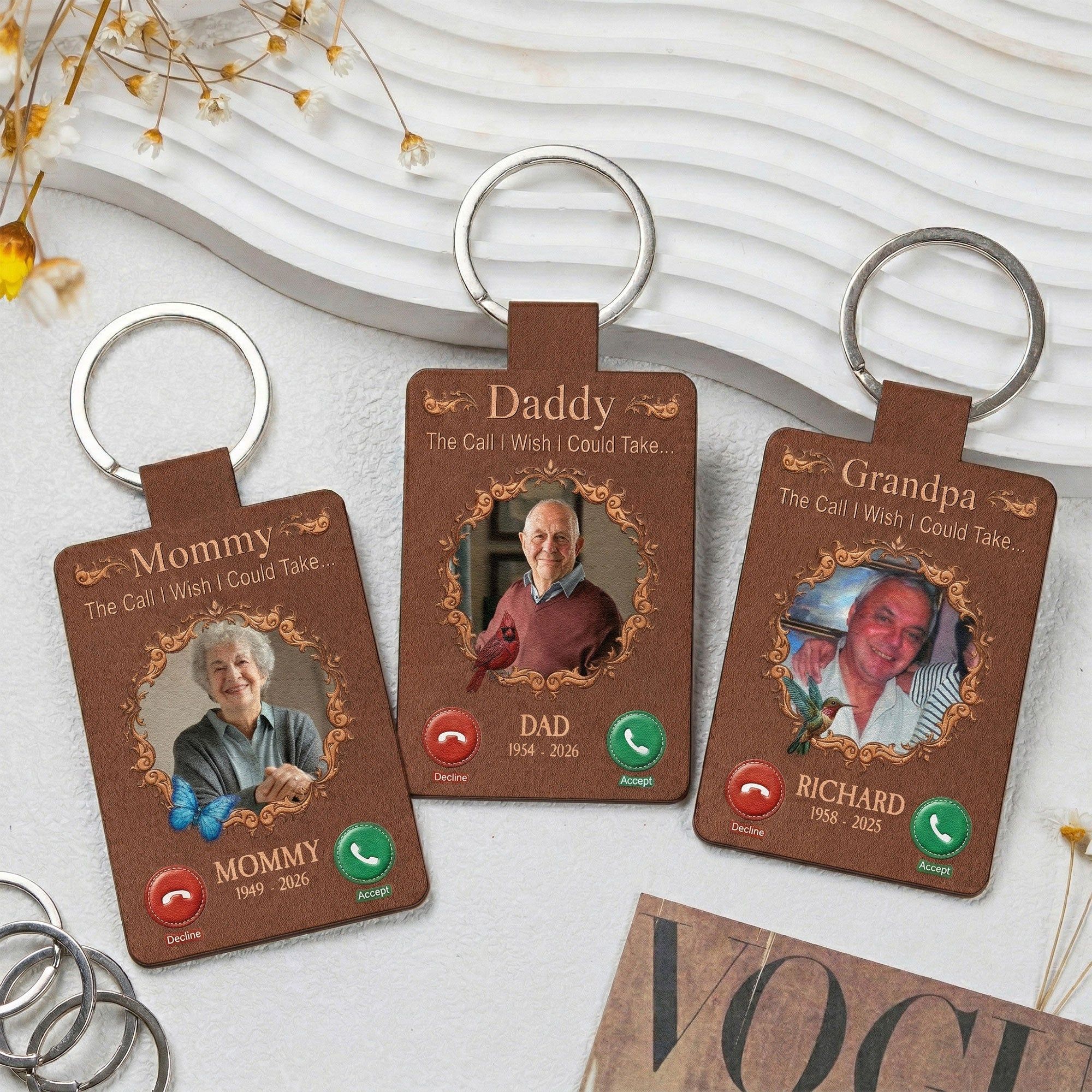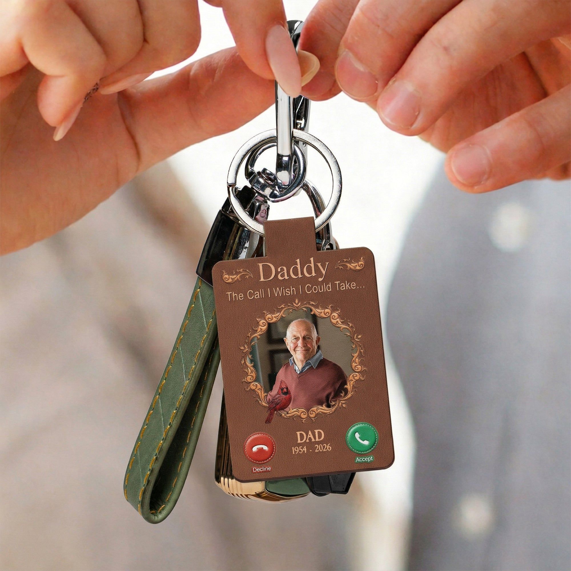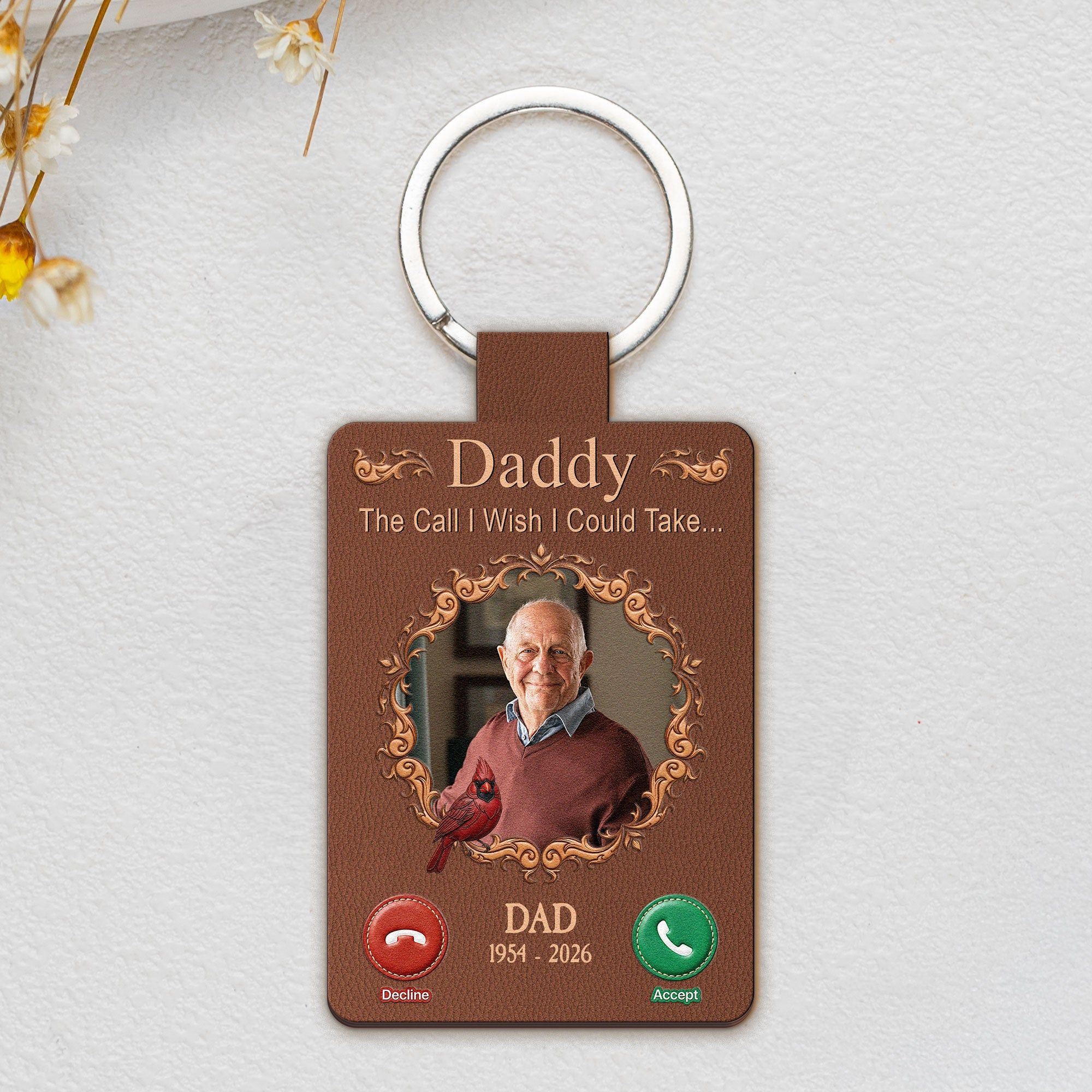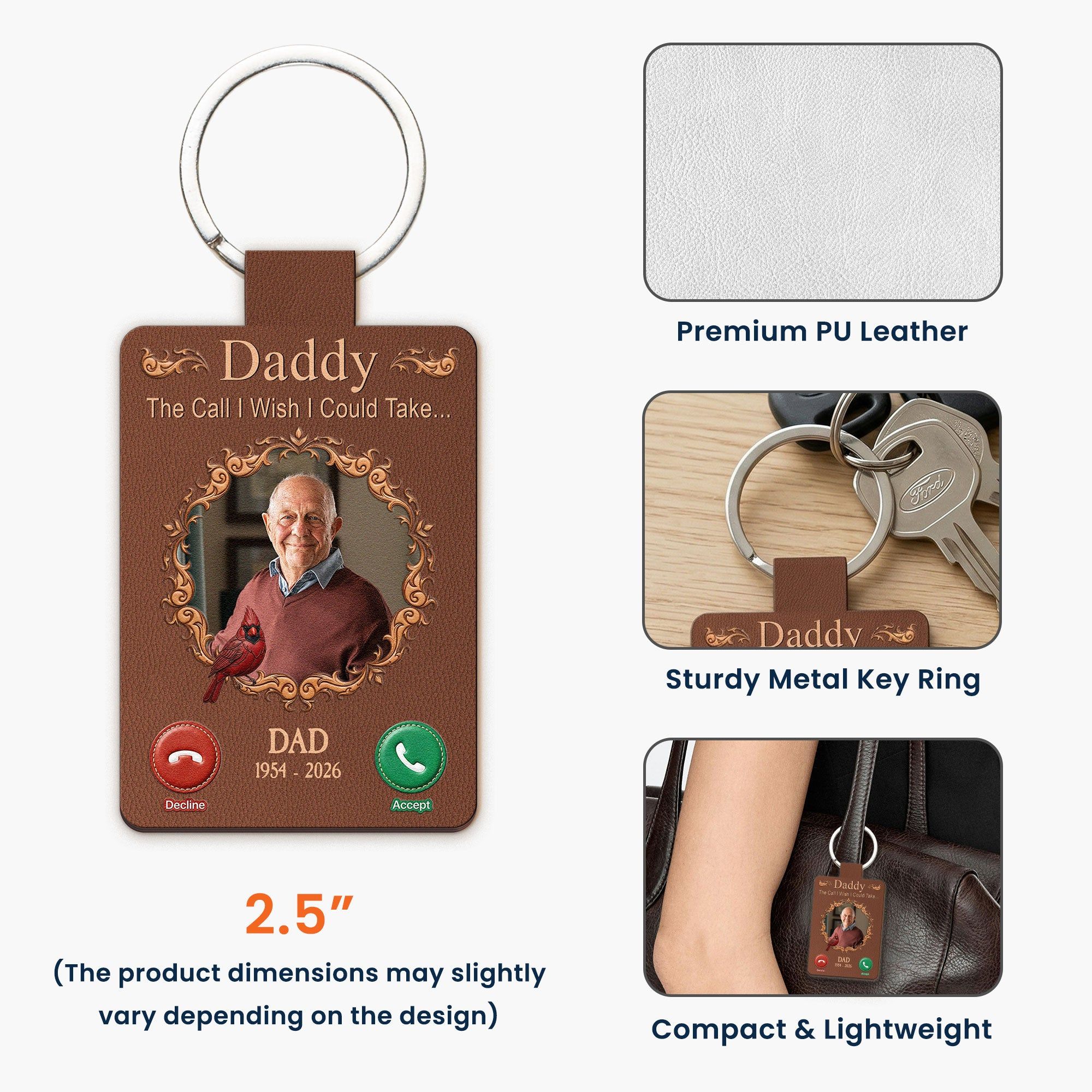 Introducing our custom shaped leather keychain, aptly named "The Call I Wish I Could Take". This memorial gift is not simply a keychain, but a tribute to your lost loved ones. Crafted with the values of bonding and resemblance, it resonates with longing and love, reminding us of the person who left their footprints on our hearts. This carefully fashioned memento is designed to honor their memory and the familial bond you shared. It subtly carries the poignant message through its unique design, never letting their presence fade away.